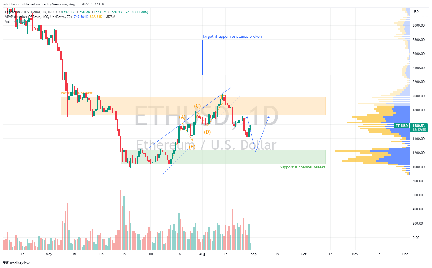 The merge is almost here, and most traders seem well positioned as the futures basis and funding rates hit their lowest level since the beginning of the year. The ETH PoW token is priced around USD 20-30 as September futures are trading at a discount of $22 to spot. In the event of a non-bullish catalyst, I expect cryptocurrencies to hold current levels, and any volatility move is likely to be downside volatility. The ETH support remains at $1,200 and the resistance is at $2,000.