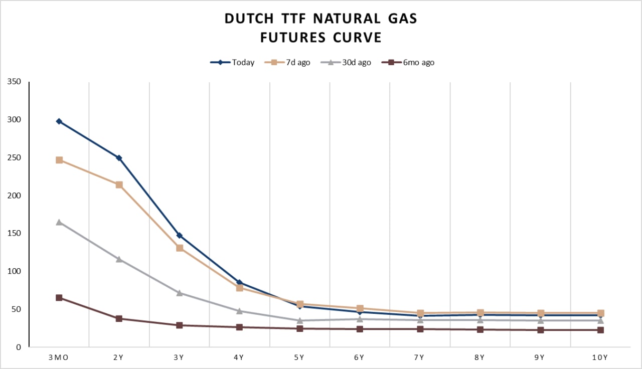 The former is more complicated, but achievable; the latter would imply an increase in EU debt, thus pushing inflation higher. Meanwhile, British households were recently told that their electricity and gas bills will go up by 80% starting on October 1st. Dutch TTF natural gas has skyrocketed as speculation and supply shortages drove demand. But it is likely to revert soon. The frontend has grown slightly (Dec 22: €297.81 today vs. €165.03 30 days ago), while the backend finds consensus around €40 (Dec 23: €42.27 today vs. €35.019 30 days ago). I expect many players to play the term structure here by shorting the 2-year contract and buying the 4-year as the spread is juicy (€157) ahead of the EU meeting on September 9th.