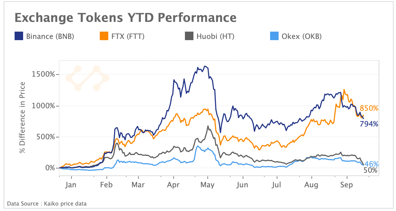 Cryptocurrency exchange-issued tokens have steadily captured investor attention over the past few years. Exchange tokens enable holders to benefit from lower transaction fees, vote on new coin listings, earn passive staking rewards, and of course bet on the exchange’s success as a business. Above, we chart YTD returns of the native tokens issued by Binance, FTX, Huobi and Okex.