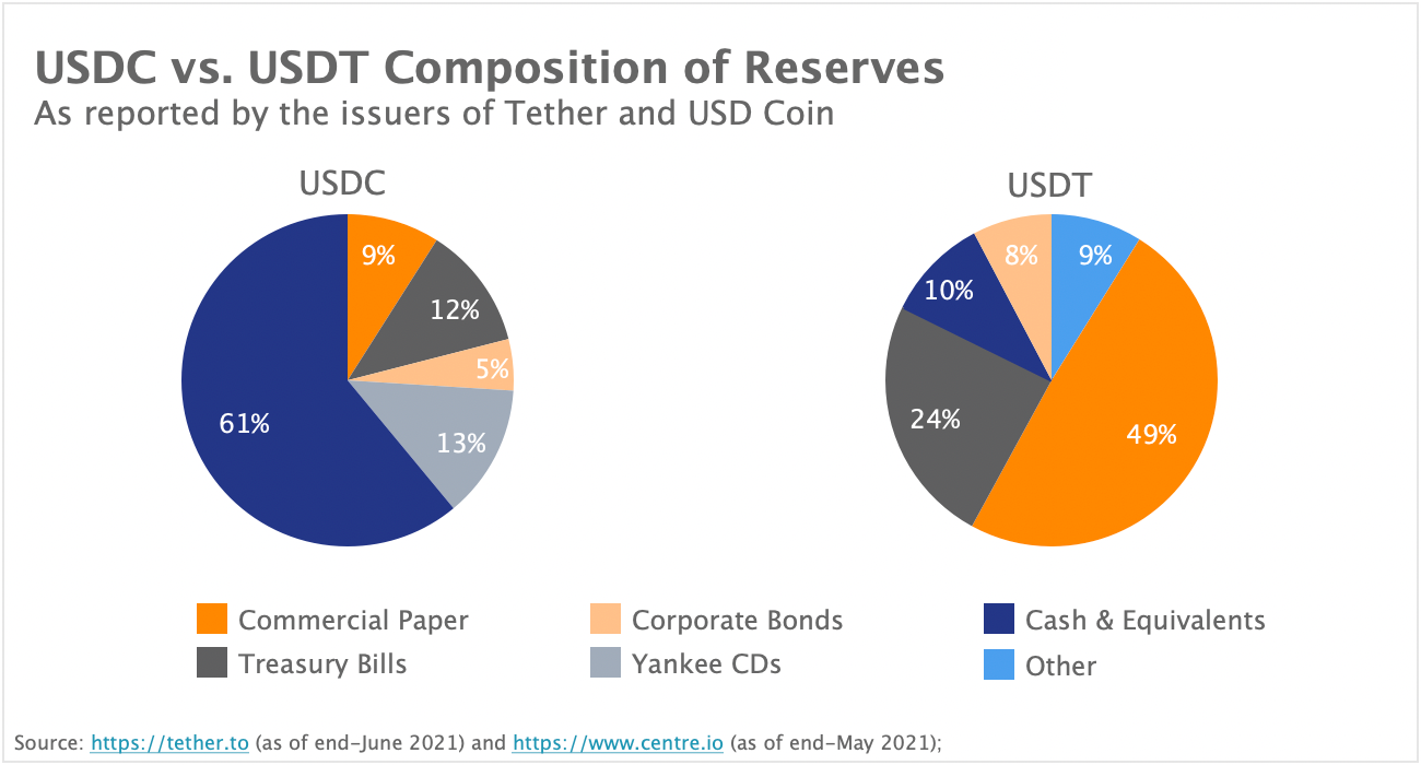 Circle holds the majority of its reserves (61%) in cash and bank deposits compared with only 10% for Tether. Commercial papers accounted for almost half of USDT reserves (49%) and just 9% of USDC’s reserves. Commercial papers are short-term unsecured debt issued by corporations and are seen as less reliable and riskier than cash. This makes Tether more exposed to global commercial paper market volatility (such as what happened with Evergrande), which could potentially result in insufficient reserves in the event of a “bank run”.