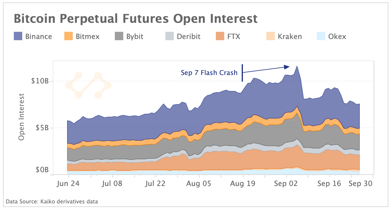 Ever since the September 7th flash crash which resulted in billions in liquidations, open interest for Bitcoin perpetual futures has failed to break previous highs reached immediately before the crash. Open interest dropped even further last Friday following news of China’s crypto ban, which saw Bitcoin crash $4k in a matter of hours. Approximately $1B in open interest was wiped out, smaller than the +$4B early this month. Open interest today rests near early August levels, which suggests traders are more cautious and de-leveraging their positions in anticipation of further volatility.
