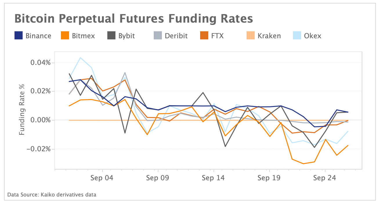 For the past few weeks, funding rates for Bitcoin perpetual futures have been in neutral territory, hovering just above 0% on most derivatives exchanges. Last week’s market volatility caused funding rates to drop into negative territory, typically a bearish sign for markets. Most of the shift happened before Friday’s China ban, allowing markets to recover over the weekend. Binance and Bybit’s funding rates now hover just below .01%, a sign that markets have stabilized.