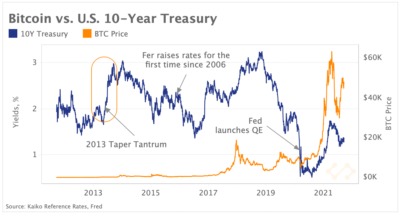 - Macro Trends: As the Fed prepares to start tapering, we take a look at U.S. Treasury Yields vs. Bitcoin.