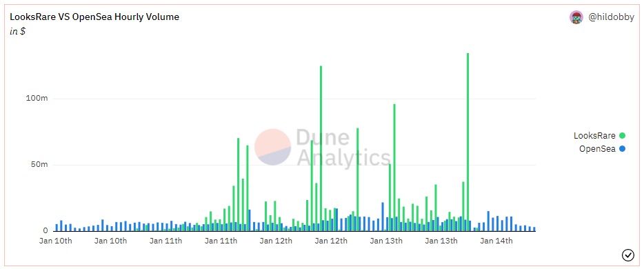 Many members of the NFT community had hoped that OpenSea would also decentralize the project with a token airdrop for early adopters, but the IPO plans suggested otherwise. Similar to Sushiswap’s “vampire attack” on Uniswap towards the end of 2020, some projects therefore decided to attract OpenSea users to their platform with their own airdrop. The first step was taken on Christmas Eve by OpenDAO with their SOS token, followed this week by the LOOKS token of the NFT marketplace LooksRare.
