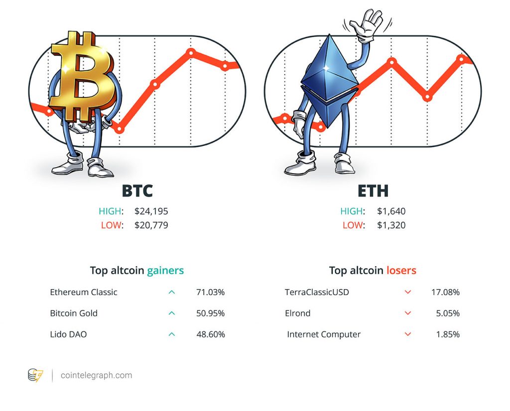 At the end of the week, Bitcoin (BTC) is at $23,478.96, Ether (ETH) at $1,598.64 and XRP at $0.36. The total market cap is at $1.06 trillion, according to CoinMarketCap.