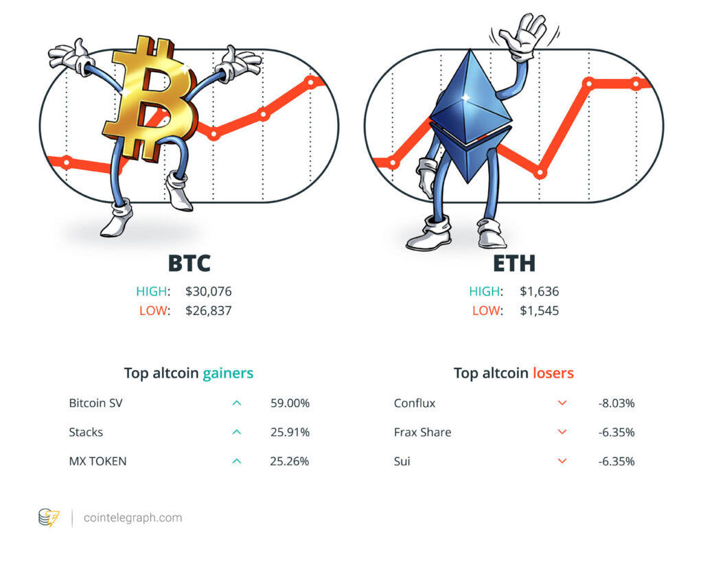 At the end of the week, Bitcoin (BTC) is at $29,590, Ether (ETH) at $1,607 and XRP at $0.52. The total market cap is at $1.12 trillion, according to CoinMarketCap.