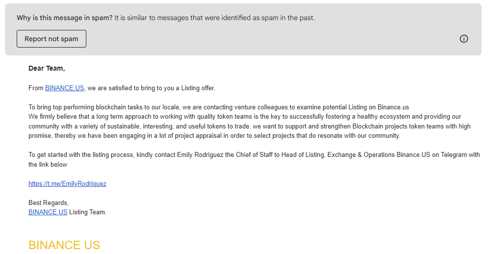 After a victim has been found, the scammer then sends a document via email or Telegram containing the details of the listing process along with a required initial security deposit for the “service.” As soon as the victim transfers the requested digital assets to the deposit address, however, the scammer breaks off all contact and pockets the funds.
