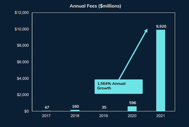 The bullish forecast for ETH began by showing how Ethereum generated nearly $10 billion in fees in 2021. According to the report, that is a 1,564% annual growth rate from 2020.
