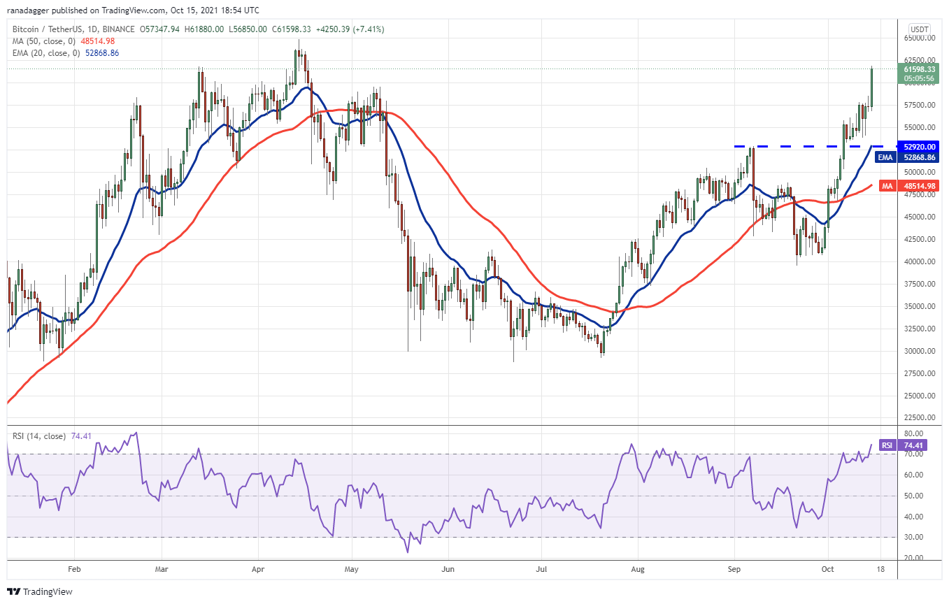The 20-day exponential moving average ($52,868) is sloping up and the relative strength index (RSI) is in the overbought zone, suggesting that bulls are in control. However, the all-time high at $64,854 may prove to be a difficult hurdle to cross.