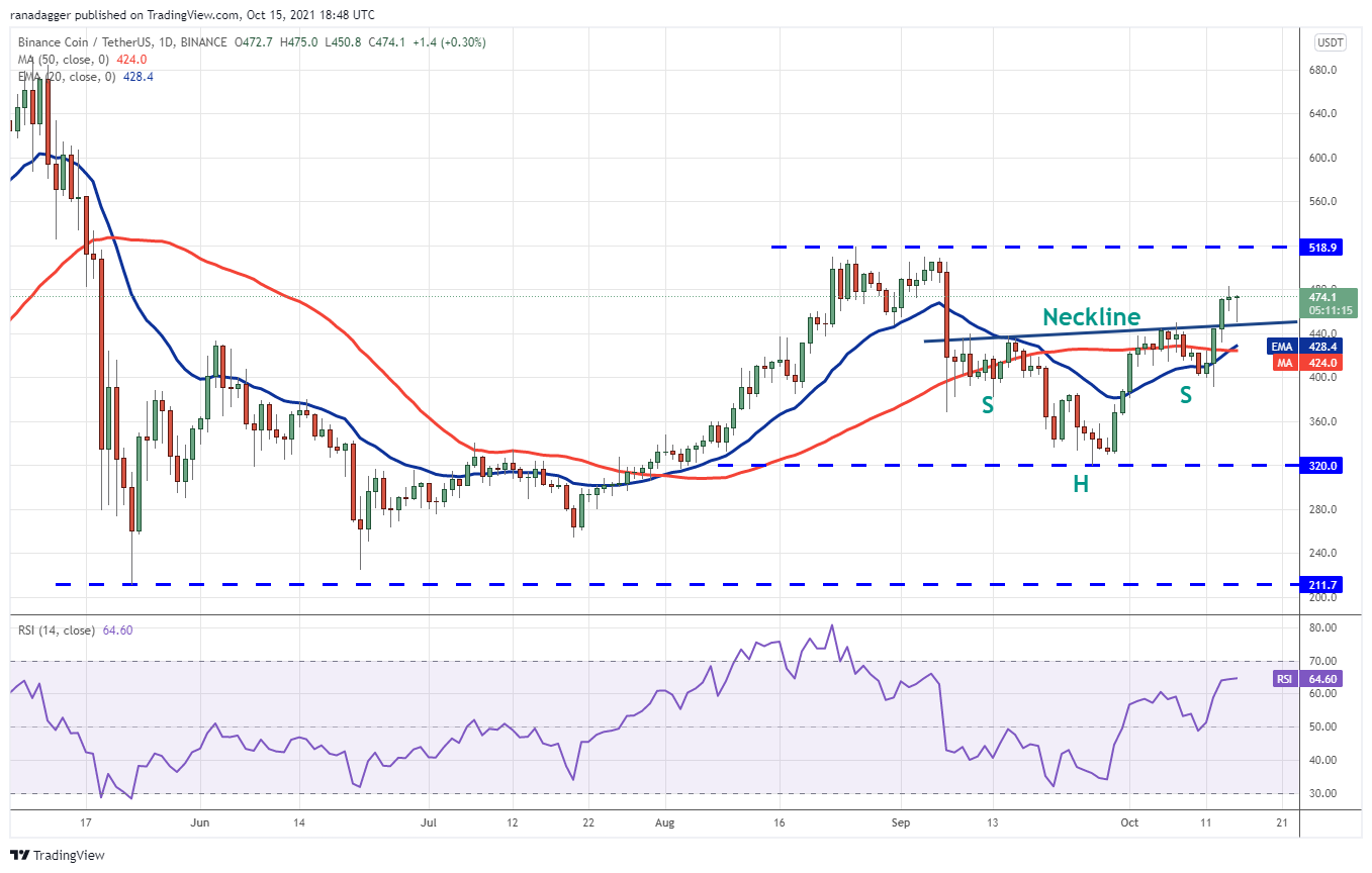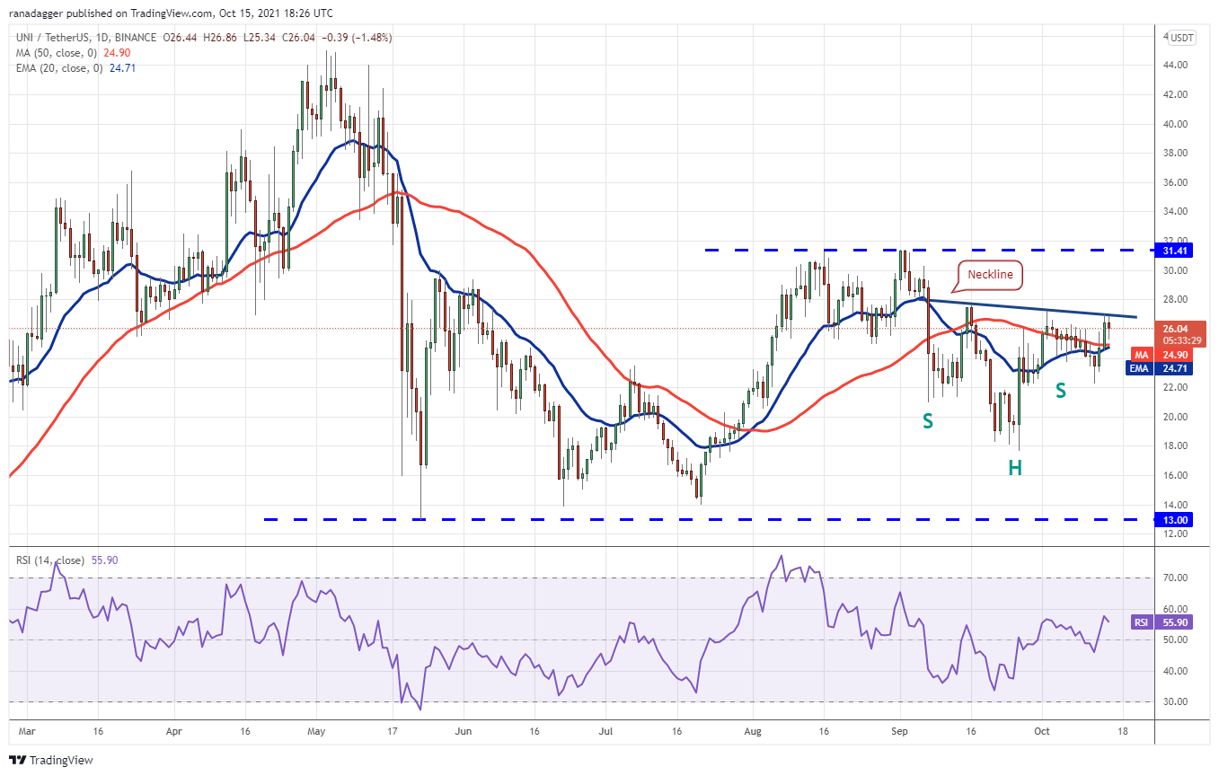 Uniswap (UNI) rose above the moving averages on Oct. 13 and reached the neckline of the inverse H&S pattern on Oct. 14. The bears are currently attempting to stall the recovery at the neckline.