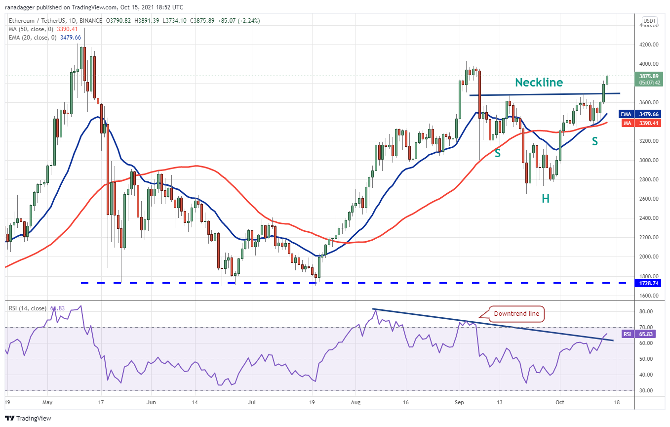 Ether (ETH) bounced off the 20-day EMA ($3,479) on Oct. 13 and broke above the neckline of the inverse head and shoulders (H&S) pattern on Oct. 14. This completed the bullish setup which has a target objective at $4,657.