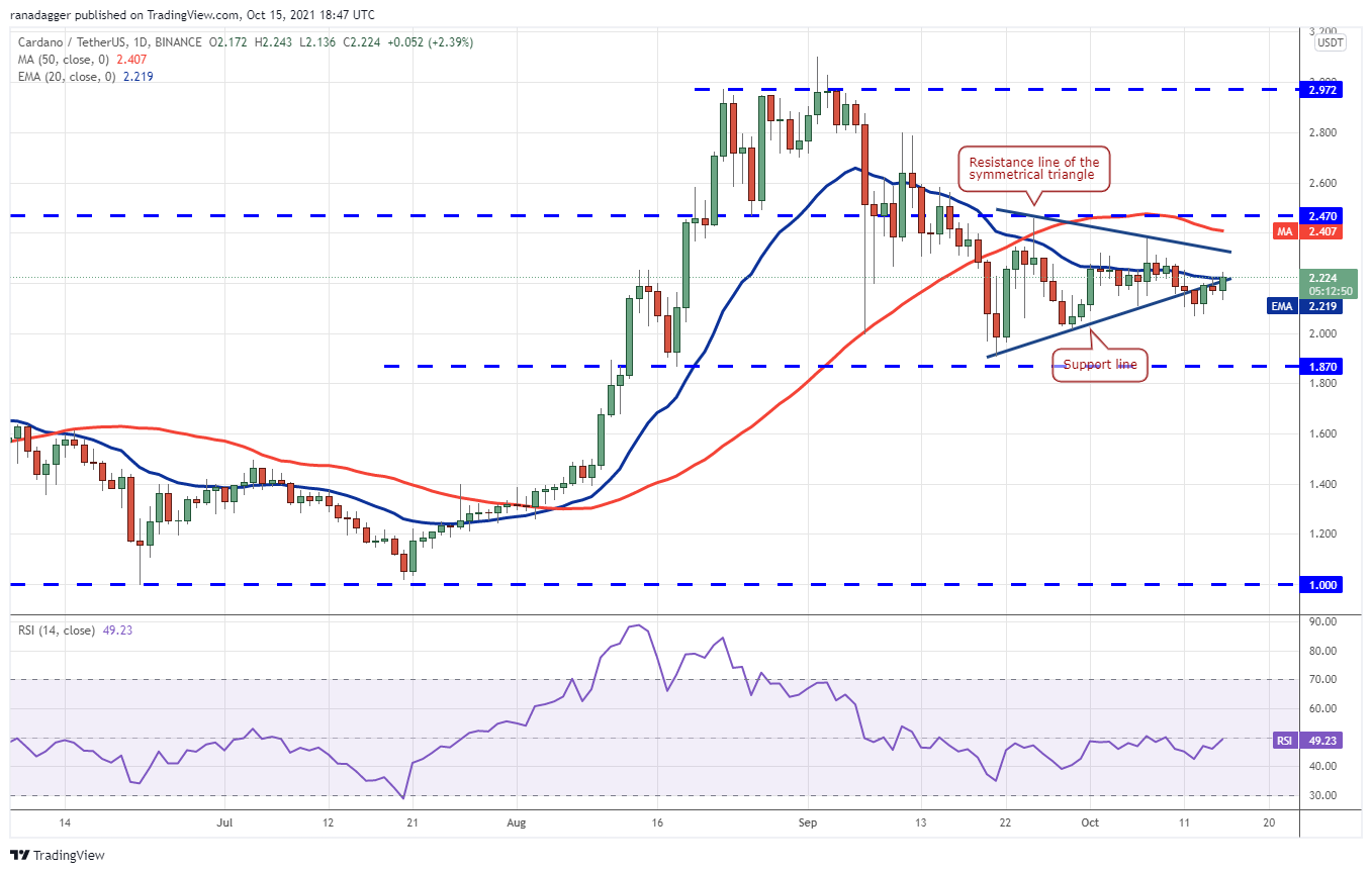 The bulls are attempting to push Cardano (ADA) back into the symmetrical triangle pattern but the bears are not relenting. They are defending the support line and the 20-day EMA ($2.21) with vigor.