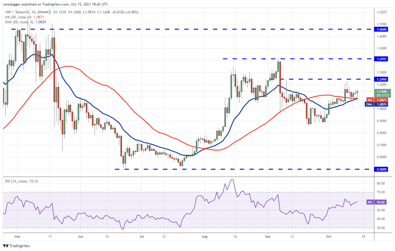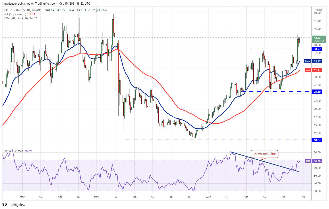 The bears tried to pull the price back below $38.77 on Oct. 14 and today but failed. This shows that buyers are aggressively defending the breakout level. If bulls drive the price above $43.22, the DOT/USDT pair could retest the all-time high at $49.78.