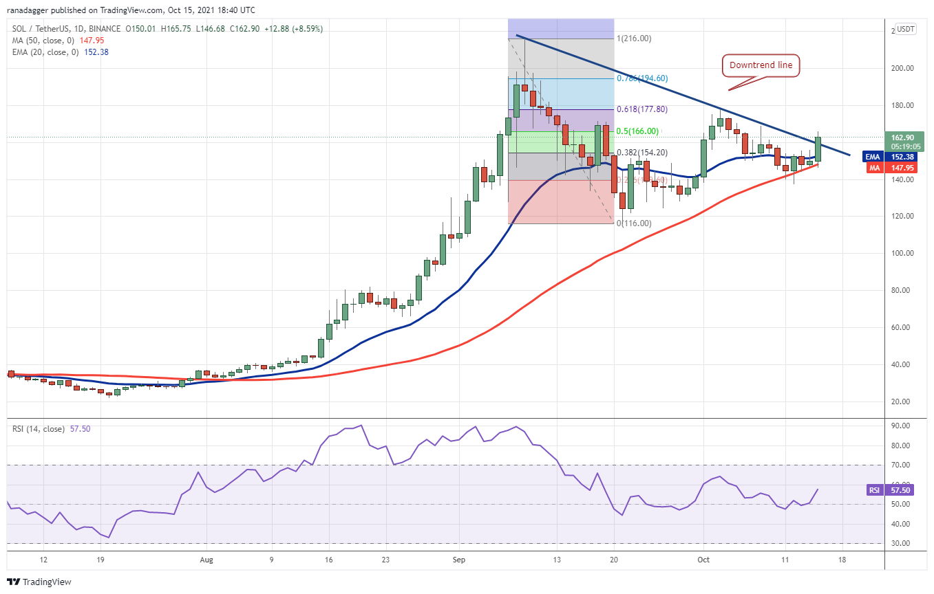 The failure of the bears to sink Solana (SOL) below the 50-day SMA ($147) in the past few days indicates accumulation by the bulls. The buyers are currently attempting to sustain the price above the downtrend line.