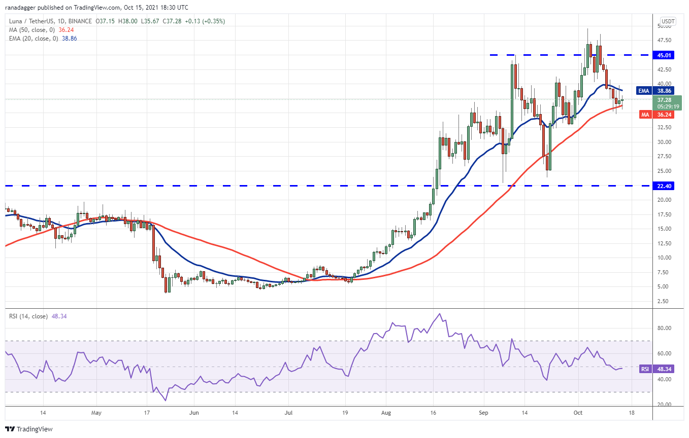 Terra protocol’s LUNA token is finding support at the 50-day SMA ($36.24) for the past three days but the bulls have not been able to drive the price above the 20-day EMA ($38.86). This suggests that demand dries up at higher levels.