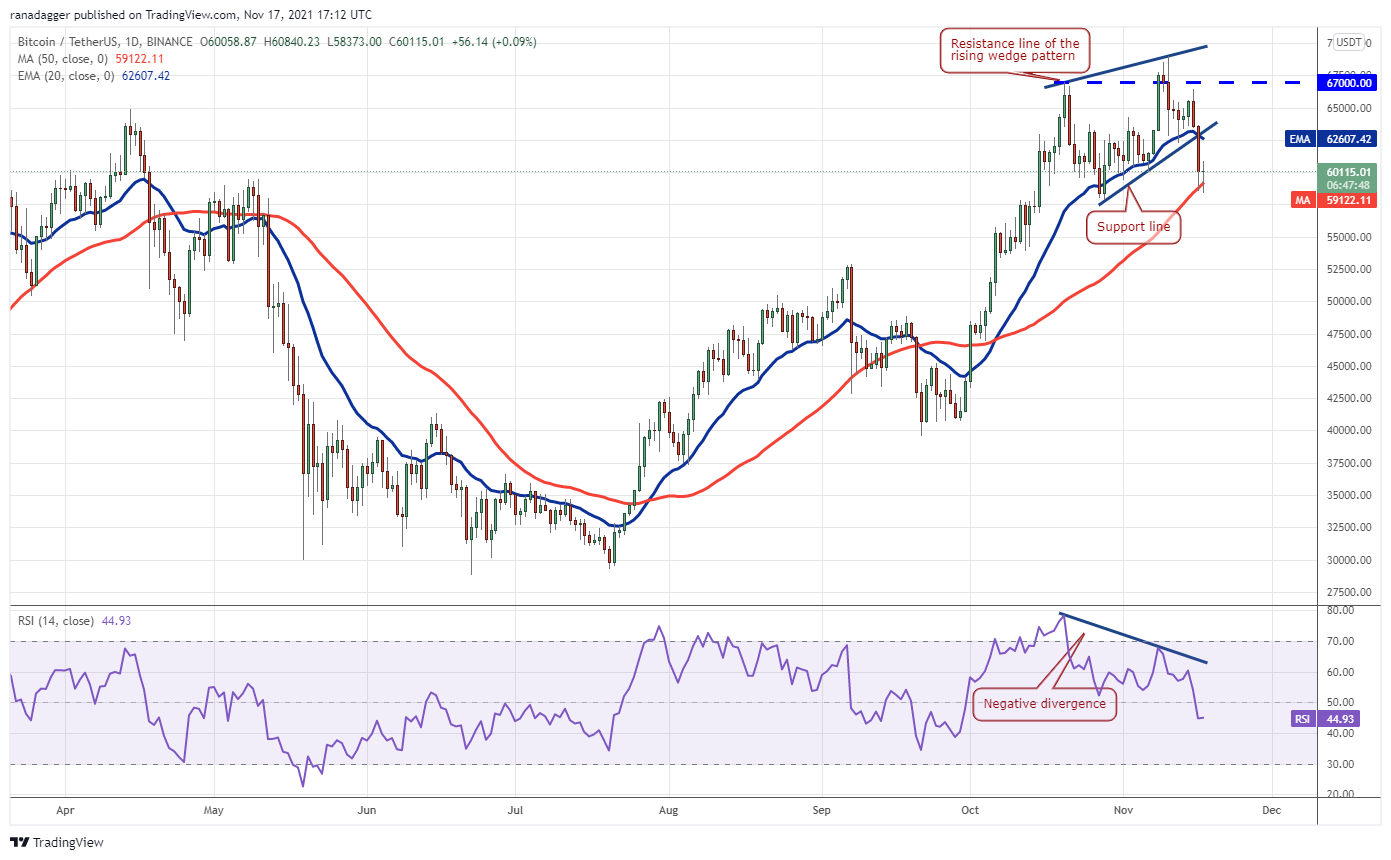 Bitcoin plummeted below the 20-day exponential moving average ($62,607) and the support line of the rising wedge pattern on Nov. 16. This is the first sign that bulls may be losing their grip.