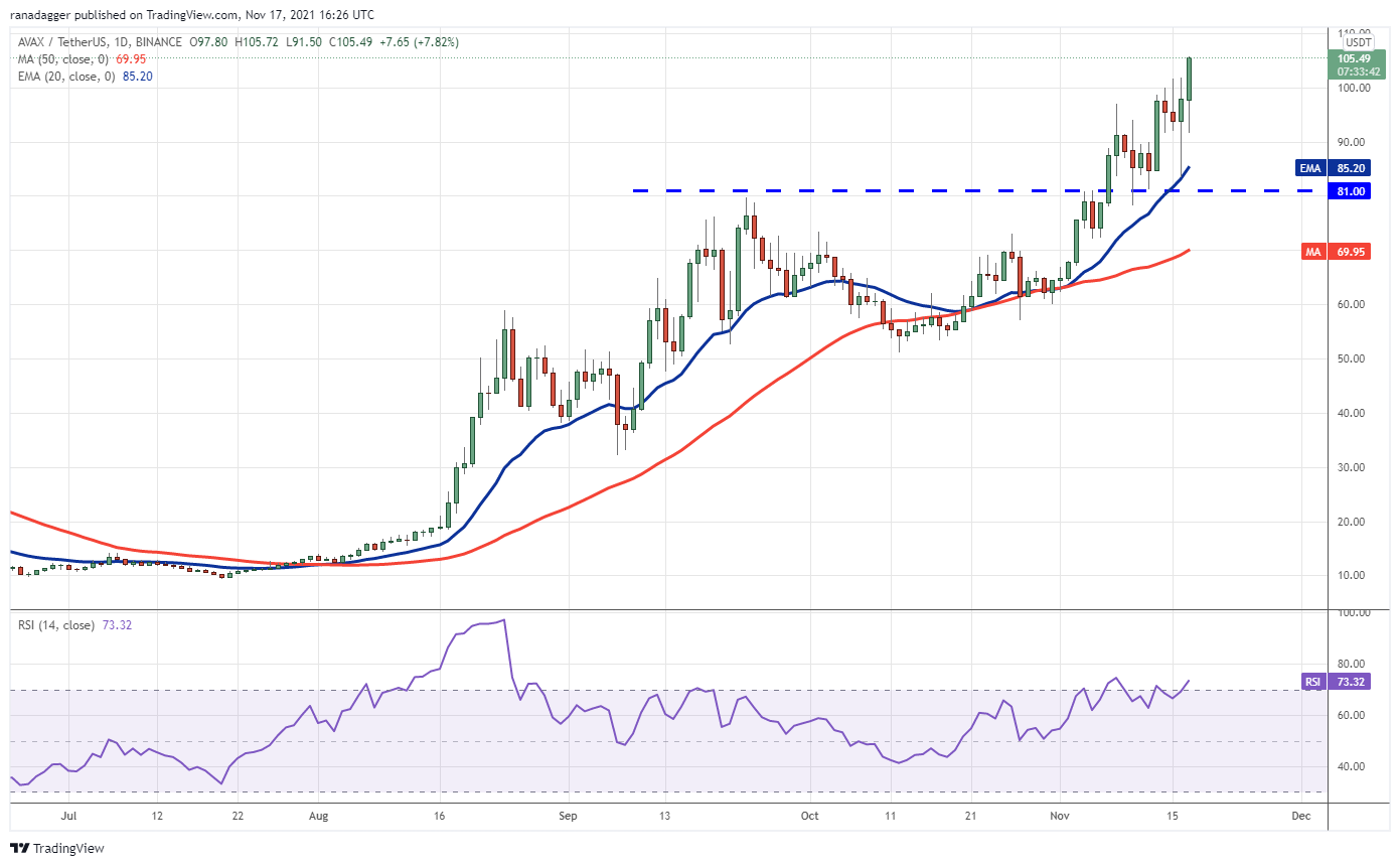 Avalanche (AVAX) is in an uptrend. The bears tried to stall the up-move and sink the price below the key support level at $81 on Nov. 16 but the bulls did not relent. The long tail on the day’s candlestick shows that buyers defended the 20-day EMA ($85.20) with vigor.