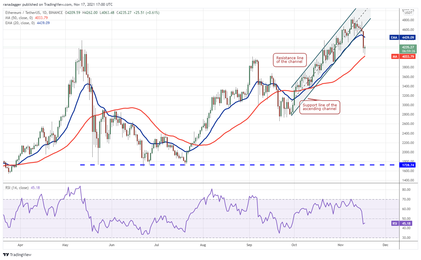 Ether broke below the ascending channel on Nov. 15 and that was followed by further selling on Nov. 16, which pulled the price below the 20-day EMA ($4,439). This was the first close below the 20-day EMA since Oct. 1.