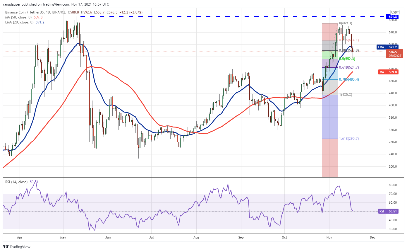Binance Coin (BNB) turned down from the overhead resistance at $669.30 on Nov. 15 and plunged below the 20-day EMA ($591) on Nov. 16. The selling continued today and the bears pulled the price near the 50% Fibonacci retracement level at $552.30.