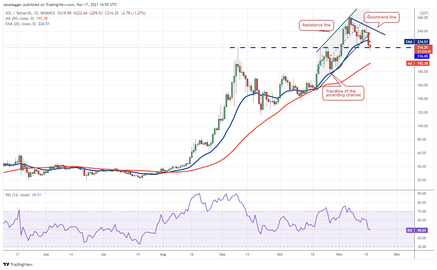 Solana (SOL) plunged below the ascending channel and the 20-day EMA ($224) on Nov. 16, indicating that the bulls may be losing their grip. The buyers are attempting to defend the breakout level at $216 but any bounce is likely to face selling at higher levels.
