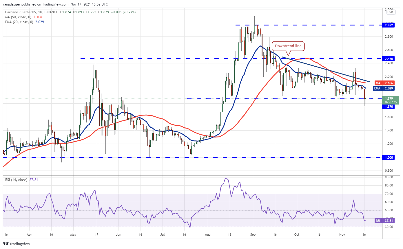 Cardano (ADA) turned down sharply on Nov. 16 and broke below the critical support at $1.87 but a minor positive is that bulls did not allow the price to close below it. The long tail on the candlestick indicates that buyers are attempting to defend the support.