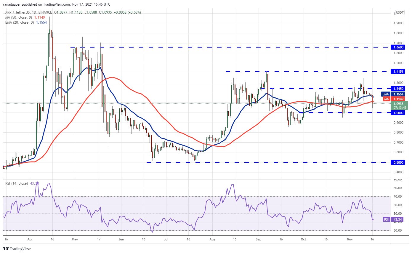 The long wick on XRP’s Nov. 15 candlestick shows that bears sold on rallies to the overhead resistance at $1.24. The selling accelerated on Nov. 16 and bears pulled the price back below the moving averages.