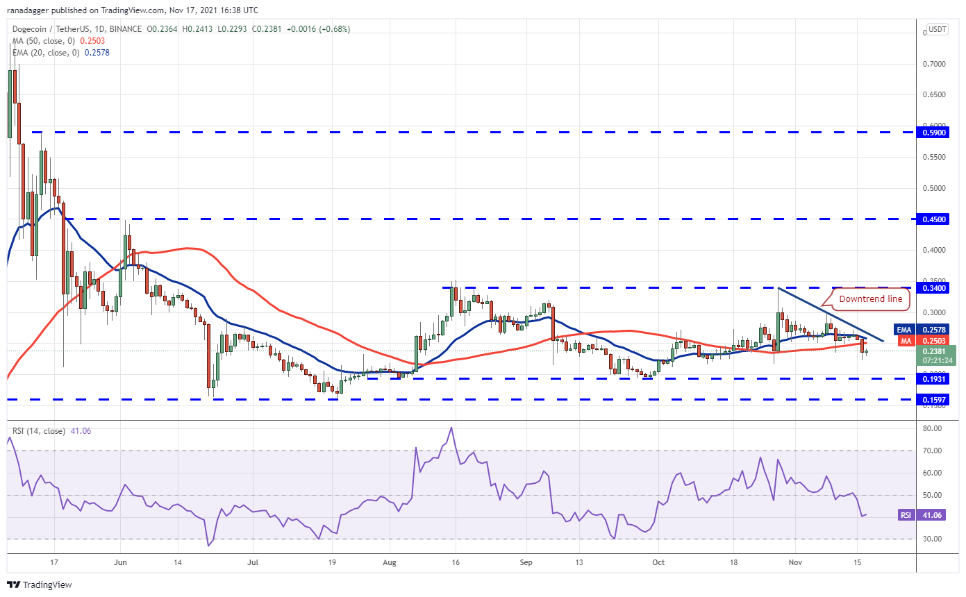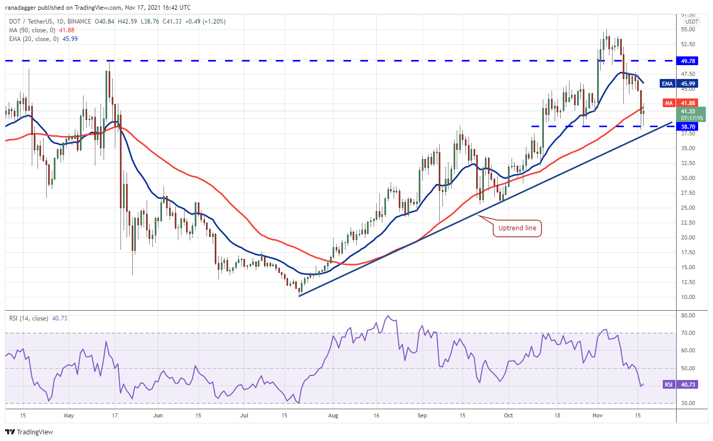Polkadot’s (DOT) failure to climb back above the 20-day EMA($45.99) may have prompted profit-booking from short-term bulls and selling by the aggressive bears. This intensified the selling and pulled the price below the 50-day SMA ($41.88) on Nov. 16.