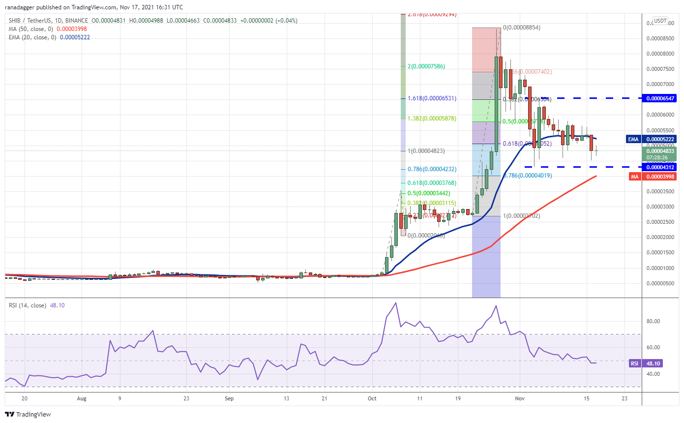 The selling continued on Nov. 16, pulling the price below the 20-day EMA. A minor positive is that bulls are attempting to defend the critical support at $0.000043. If buyers push and sustain the price above the 20-day EMA, the SHIB/USDT pair could attempt to rise to the resistance at $0.000065.