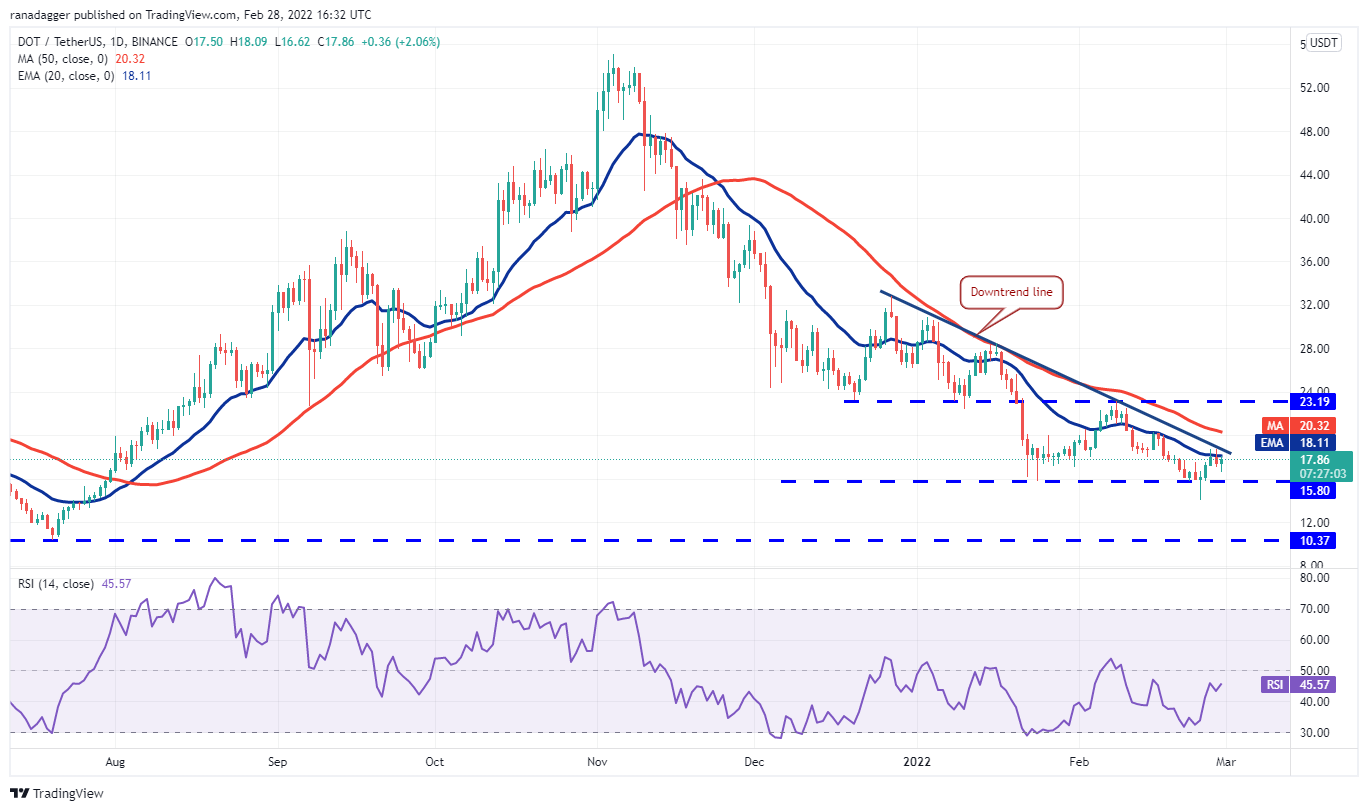 The price could remain stuck between the downtrend line and $14 for the next few days. If bears pull the price below $14, the DOT/USDT pair could resume its downtrend and decline to the strong support at $10.