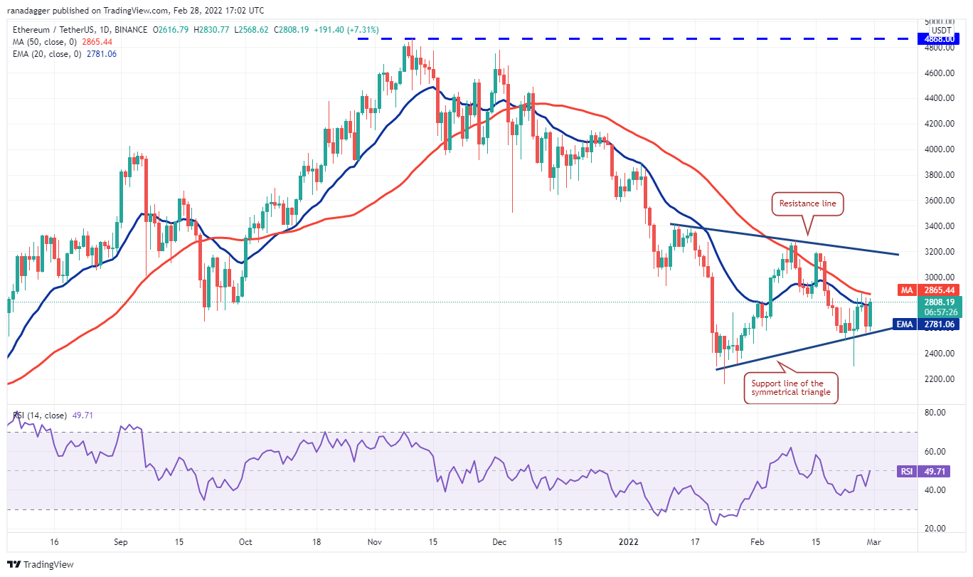 Ether (ETH) turned down from the 50-day SMA ($2,865) and dropped to the support line of the triangle indicating that higher levels continue to attract selling by the bears.