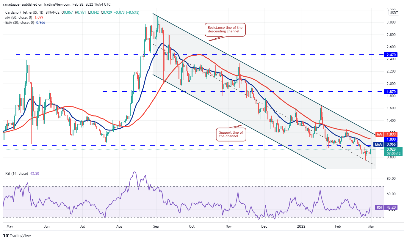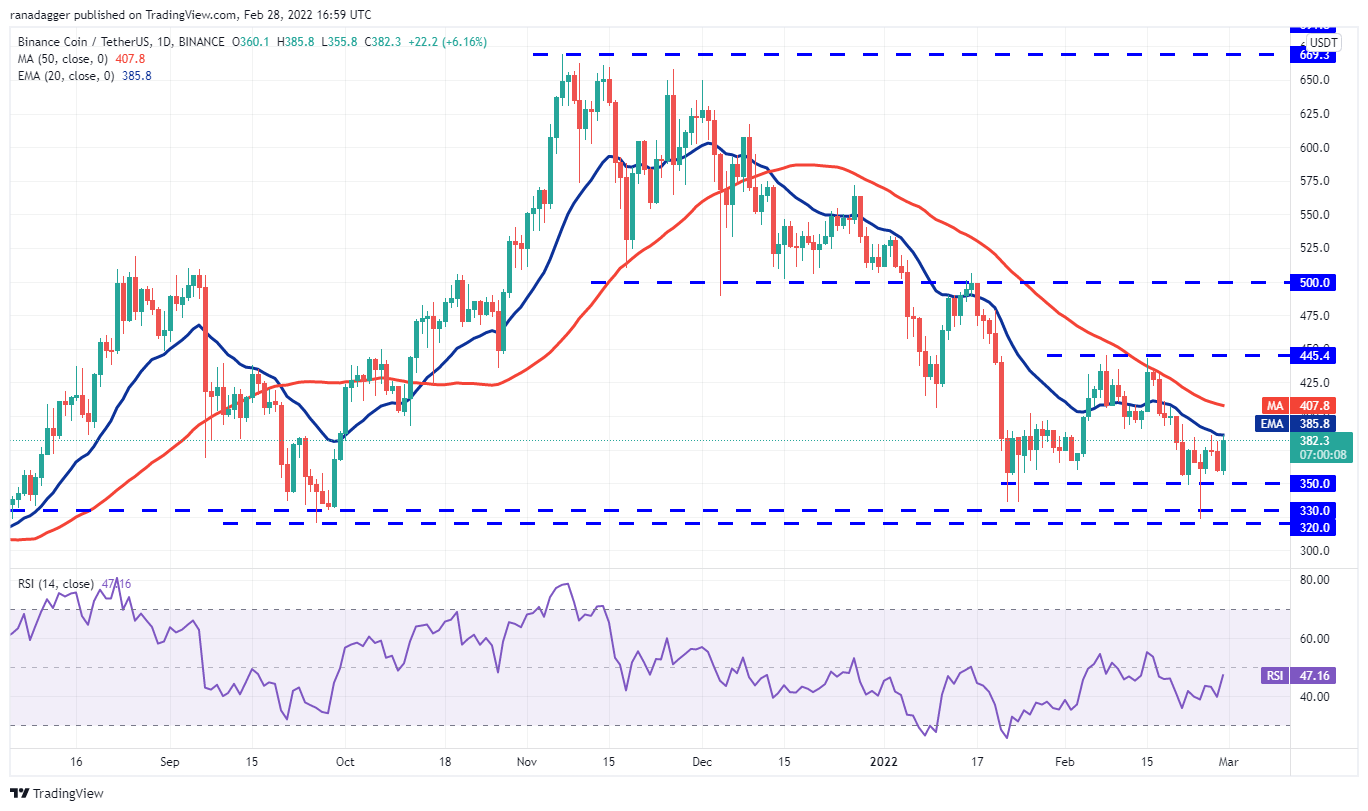 Binance Coin (BNB) turned down from the 20-day EMA ($385) on Feb. 26 but the price has rebounded sharply off the strong support at $350 on Feb. 28. This indicates that the price is stuck between these two levels.