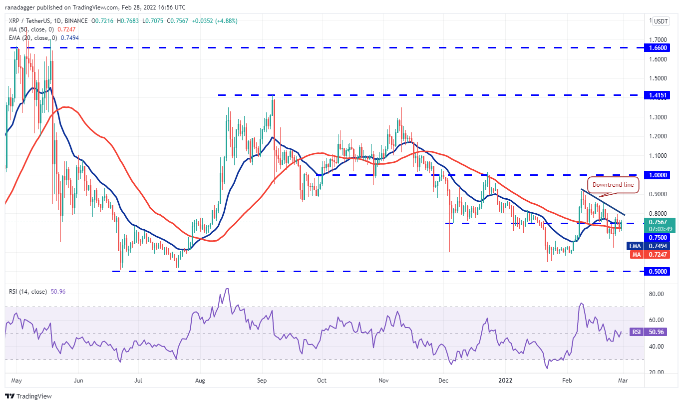 Ripple (XRP) turned down from the downtrend line on Feb. 26, indicating that bears are defending this resistance with vigor. A minor positive is that the bulls are defending the support at the 50-day SMA ($0.72).