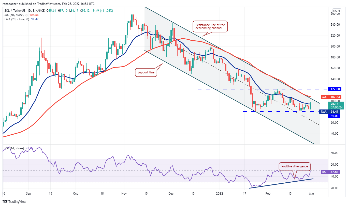 The RSI is showing signs of forming a positive divergence, signaling that the bearish momentum may be slowing. If bulls push and sustain the price above the 20-day EMA, the SOL/USDT pair could rise to the resistance line of the descending channel.