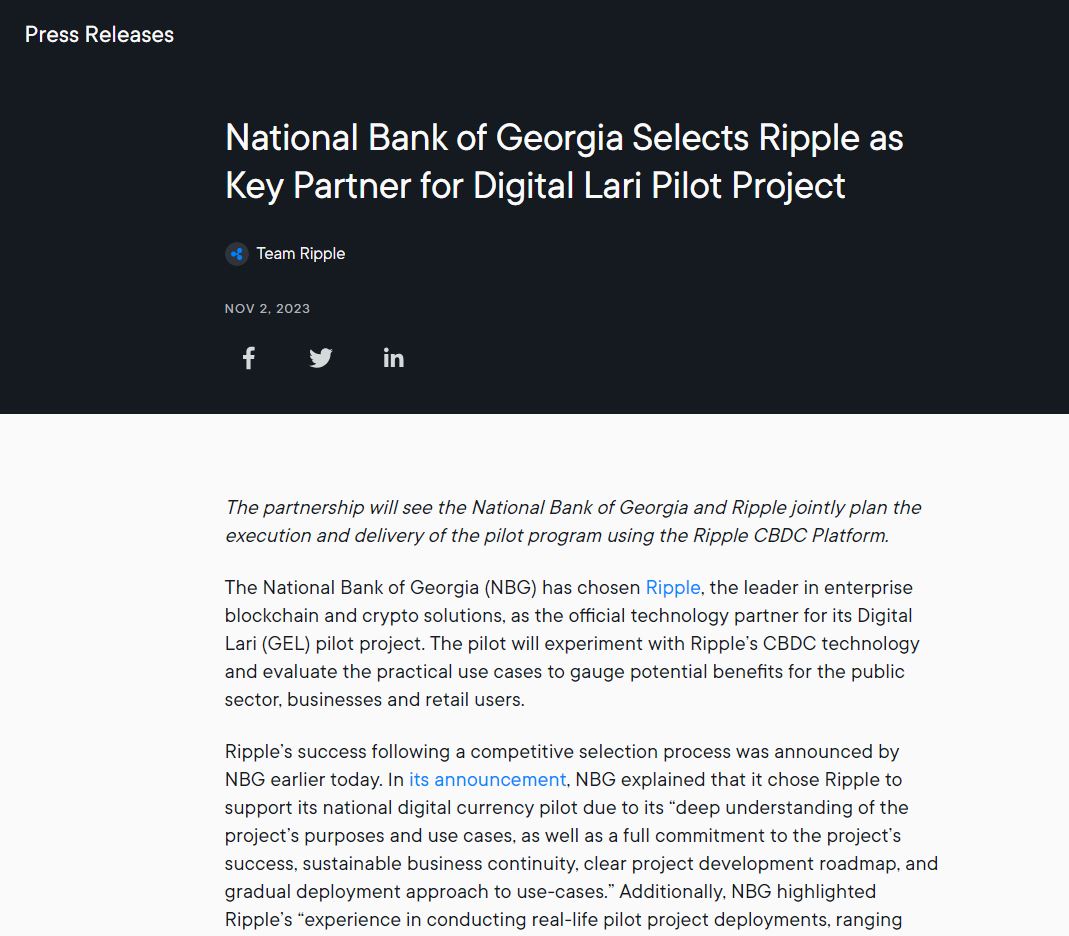 Before the partnership with the NBG for the digital lari project, Ripple had proactively aligned itself with organizations seeking to delve into CBDC implementations. Ripple previously joined forces with Colombia’s central bank, Banco de la República, to investigate blockchain technology applications in its digital peso pilot by leveraging the Ripple CBDC Platform.