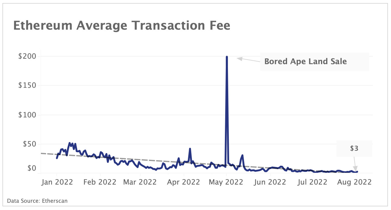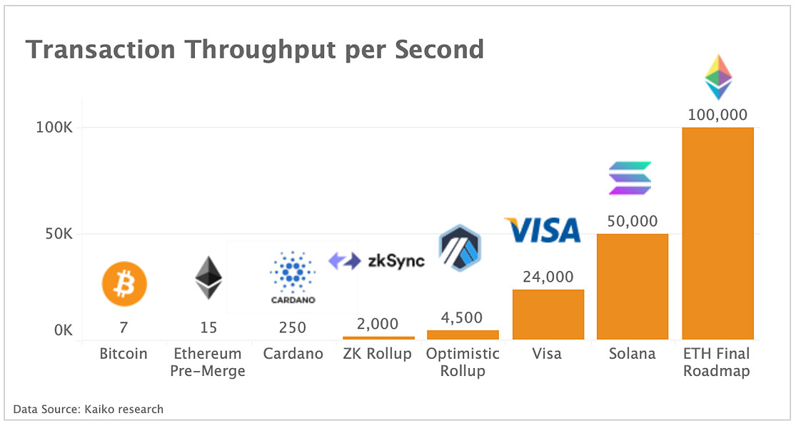 Improvements are being planned to the Ethereum network, most notably the Merge in September, which should see the energy consumption of the Ethereum blockchain reduced by about 99%. However, contrary to what some may think, the Merge itself won’t be a big factor in helping Ethereum solve its scalability issues. These fixes are due to come later in 2023 when the network begins the process of sharding. Sharding is beyond the scope of this article but it essentially entails splitting the network into shards or seperate pieces in order to reduce congestion and improve transaction throughput. Transaction throughput is where Ethereum struggles compared to its ambitions to be the backbone of a new financial system. Currently, Ethereum can only handle about 15 transactions per second, compared to Visa’s 24,000 and Solana’s 50,000.