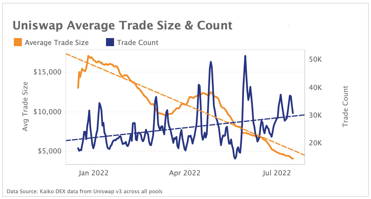 A falling transaction fee is exactly what Ethereum needs, however in this instance it’s related to a lack of demand. TVL of DeFi projects has plummeted while NFTs are in their first ever bear market, all combining to bring blockspace demand to recent lows. However, the low fees do offer us a glimpse into how Ethereum users might interact with protocols in the future if the fees weren’t so prohibitive. As decentralized exchange volume decreases year to date, one would assume that this paints a sufficient picture of the activity on these platforms. However, an interesting trend to examine is trade count, which arguably shows the actual usage on an exchange. Trade size is also a useful barometer for institutional vs. retail activity and for the purposes of this article, a smaller trade size is indicative of more retail usage. Take Uniswap and Curve for example, Ethereum’s two largest decentralized exchanges by volume. Have users adjusted their behaviors in light of the lower fees?