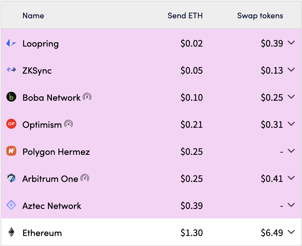 There are two main types of rollups, Optimistic and zK rollups, and their cost saving benefits have been clear to see already. Below are the fee comparisons between various Layer 2’s and Ethereum, according to l2fees.info.