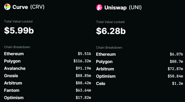 Looking specifically at Uniswap and Curve’s breakdown of total value locked (TVL), we can see that only a small portion of their value sit on Layer 2 optimistic rollups (Optimism and Arbitrum): 1.9% on Uniswap and 1.8% on Curve. Uniswap currently has 97% of TVL sitting on the Ethereum mainchain, while Curve has 92%. It’s reasonable to expect that once a zK EVM compatible rollup is rolled out that this number will decrease and move towards Layer 2, allowing more DEX users to avail of the cheaper fees on offer.