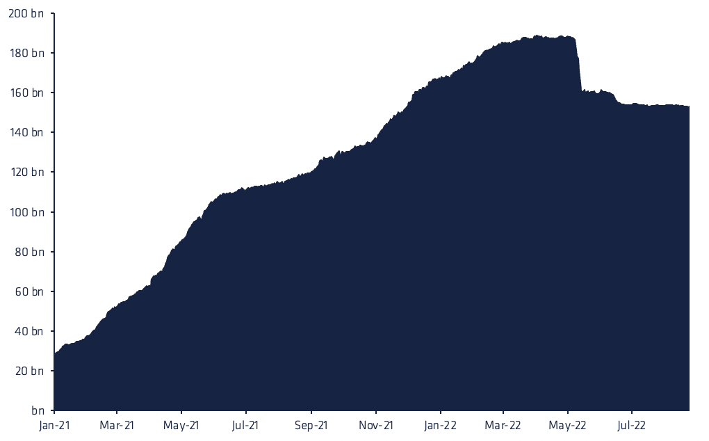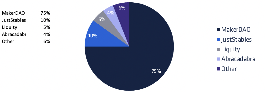 These deposits are crypto assets that have increased price volatility risk and hence loans are overcollateralised to compensate for this risk. Users can choose to return the stablecoin at any time in return for their deposited assets. The collateral ratio needed in return for CDP stablecoins depends on the crypto asset being deposited. For instance, an ETH deposit would require a 1.5 ETH deposit for every 1 ETH worth of stablecoin borrowed. Conversely, a USDC deposit that is less volatile would require a 1.25 USDC for every 1 USDC worth of stablecoin borrowed. Above we show a breakdown of the market share for the leading CDP protocols. MakerDAO is the clear leader as it pioneered the concept of CDPs in 2017. As of August 2022, the market value of all CDP stablecoins stood at ~$12bn.