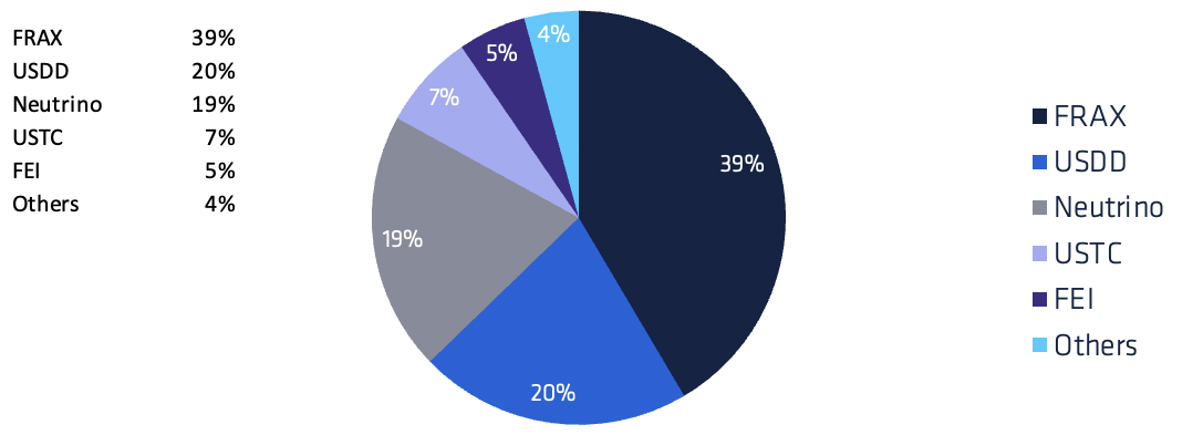 Generally, algo-stablecoins do not rely on collateral but there are also some that utilise a partial reserve model (partially backed by reserves, partially pegged by the algorithm). The specifications for all types of algo-stablecoins are still being tweaked, iterated upon, or completely redesigned. Above we show a breakdown of the market share for the leading algorithmic stablecoins. The algo-stablecoin market is valued at $3.7bn yet is more competitive than the others with the market leader, FRAX, opting for a partial reserve plus algorithmic model.