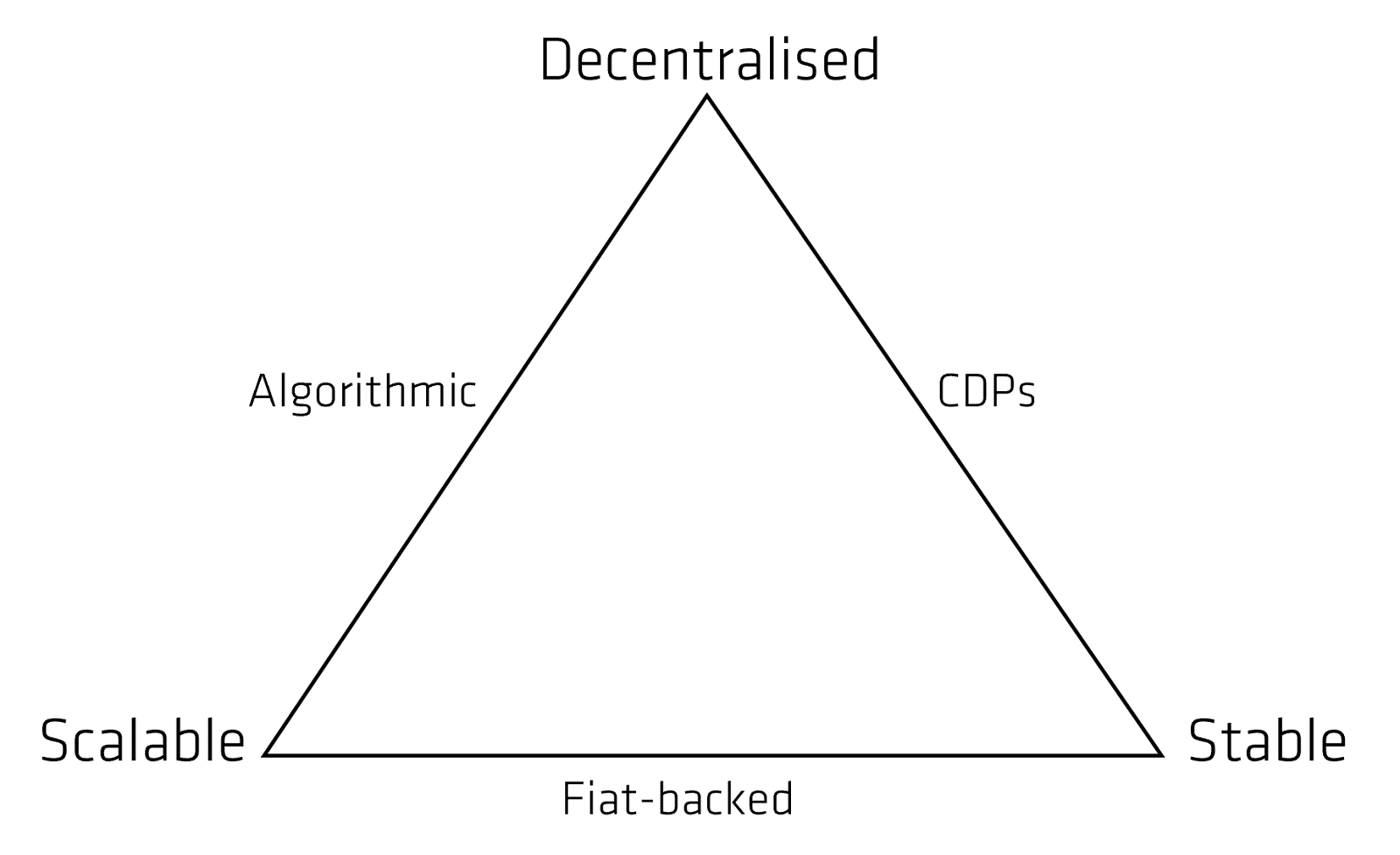 The blockchain industry is known to love its trilemmas and stablecoins are no different. The end goal for the “ideal” stablecoin is to be stable, scalable and decentralised. So far, no stablecoin has been able to fulfil all three criteria. Fiat-backed stablecoins are scalable since it’s as easy as depositing dollars in a bank account. They’re also very stable as they’re essentially backed one-to-one by those same dollars in the bank. However, they are clearly not decentralised as there are only a few large, regulated entities which can mint these stablecoins, to begin with. Stablecoin issuers also have the ability to freeze these funds, preventing specific addresses from spending them.