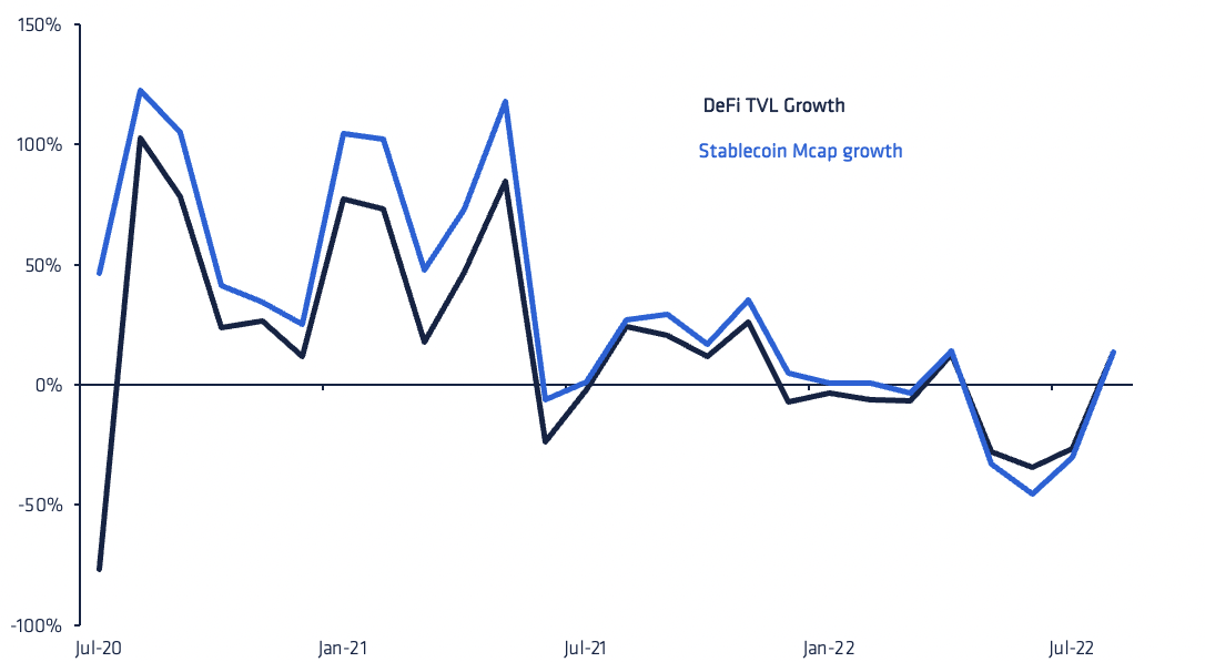 While stablecoins have become increasingly popular, the collapse of UST not only shrank the market size but also spurred redemptions in other stablecoins as well. Despite this implosion, the importance of stablecoins remains prominent across the entire ecosystem. We see below that the correlation between the growth of Total Value Locked (TVL) and the growth of stablecoins is persistently strong.