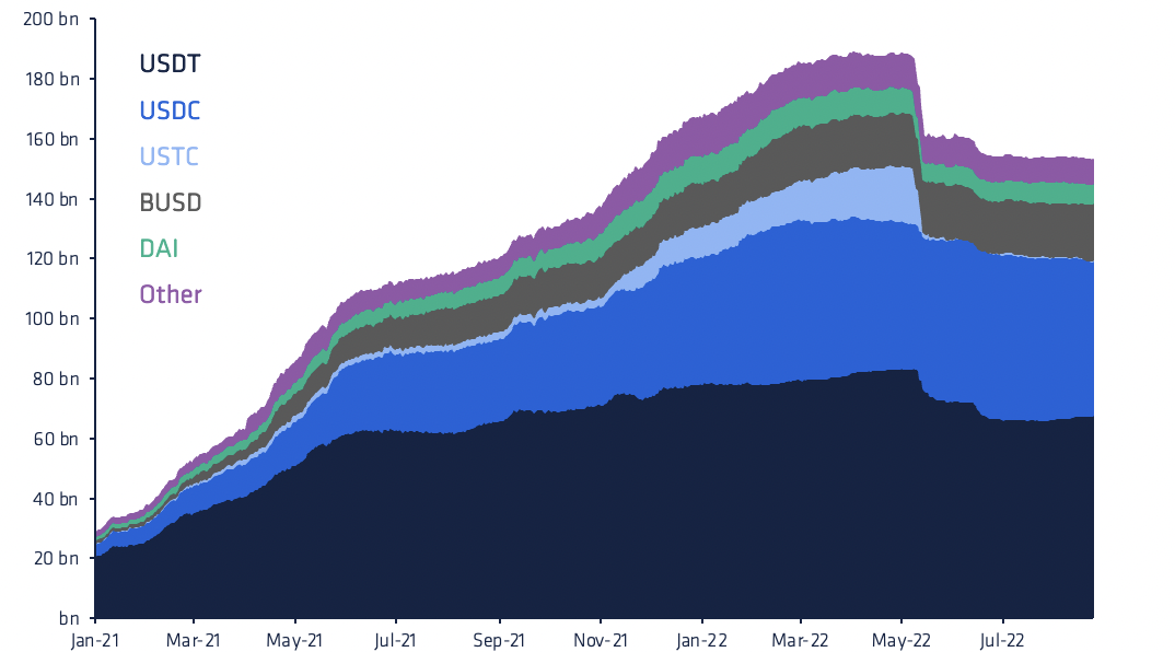The sharp drop seen in May 2022 arose from the collapse of UST, a stablecoin native to the Terra blockchain which also collapsed as a result. The dissolution of the UST highlights that not all stablecoins are made equal and each type poses its own trade-offs and risks. There are three types of stablecoins: