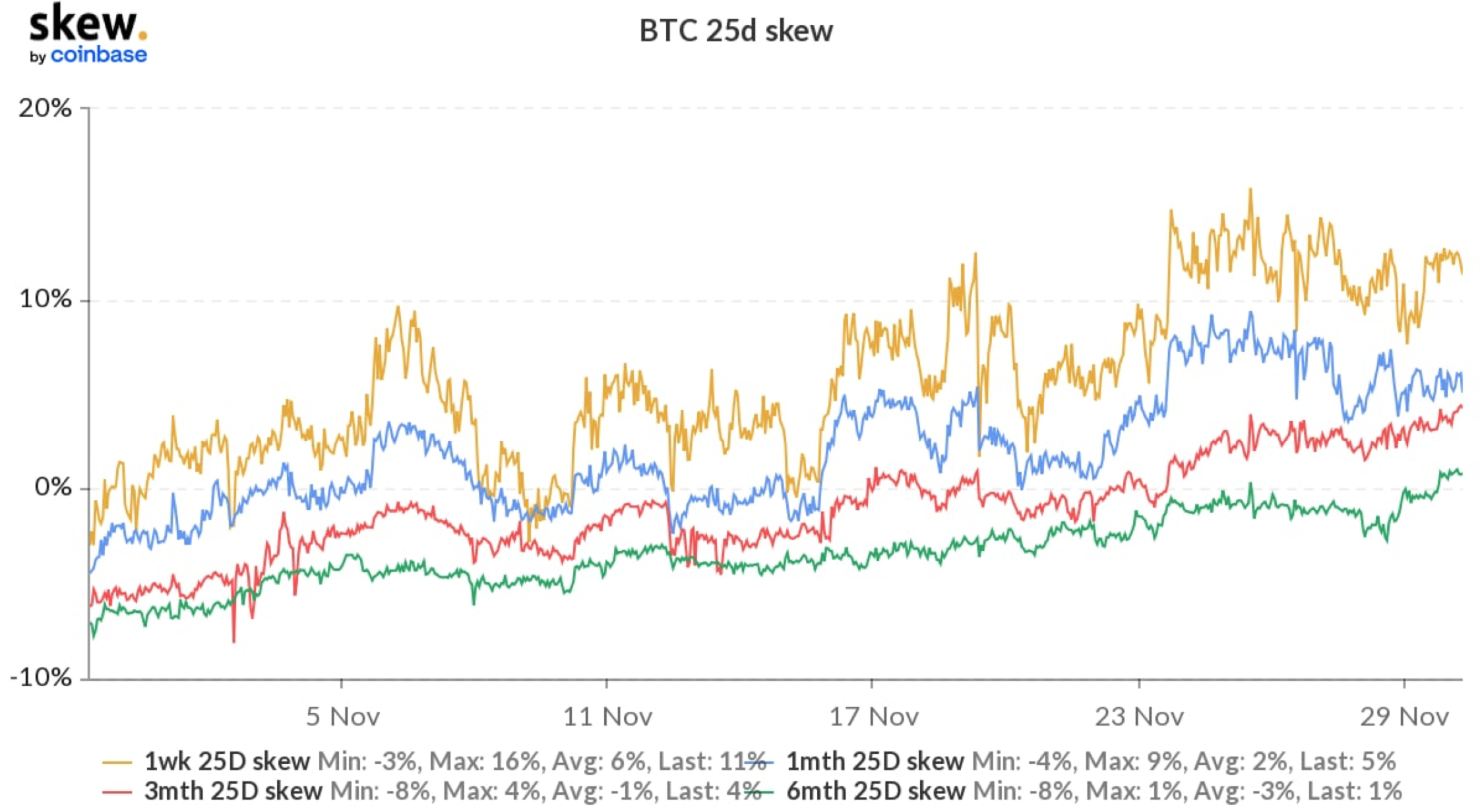 Realized volatility (RV) increased on the back of the spot price sell-off, but not enough to change the shape of the term structure. A sharp sell-off is likely the only catalyst for sharply higher RV, justifying current option skews. Otherwise, I expect muted RV reactions to the upside. From now on, all eyes are on December 31. I still believe that there is still the opportunity for an end of year bull run towards 70k, as BTC showed strong support at $54k, and quickly recovered from Black Friday’s discounts.
