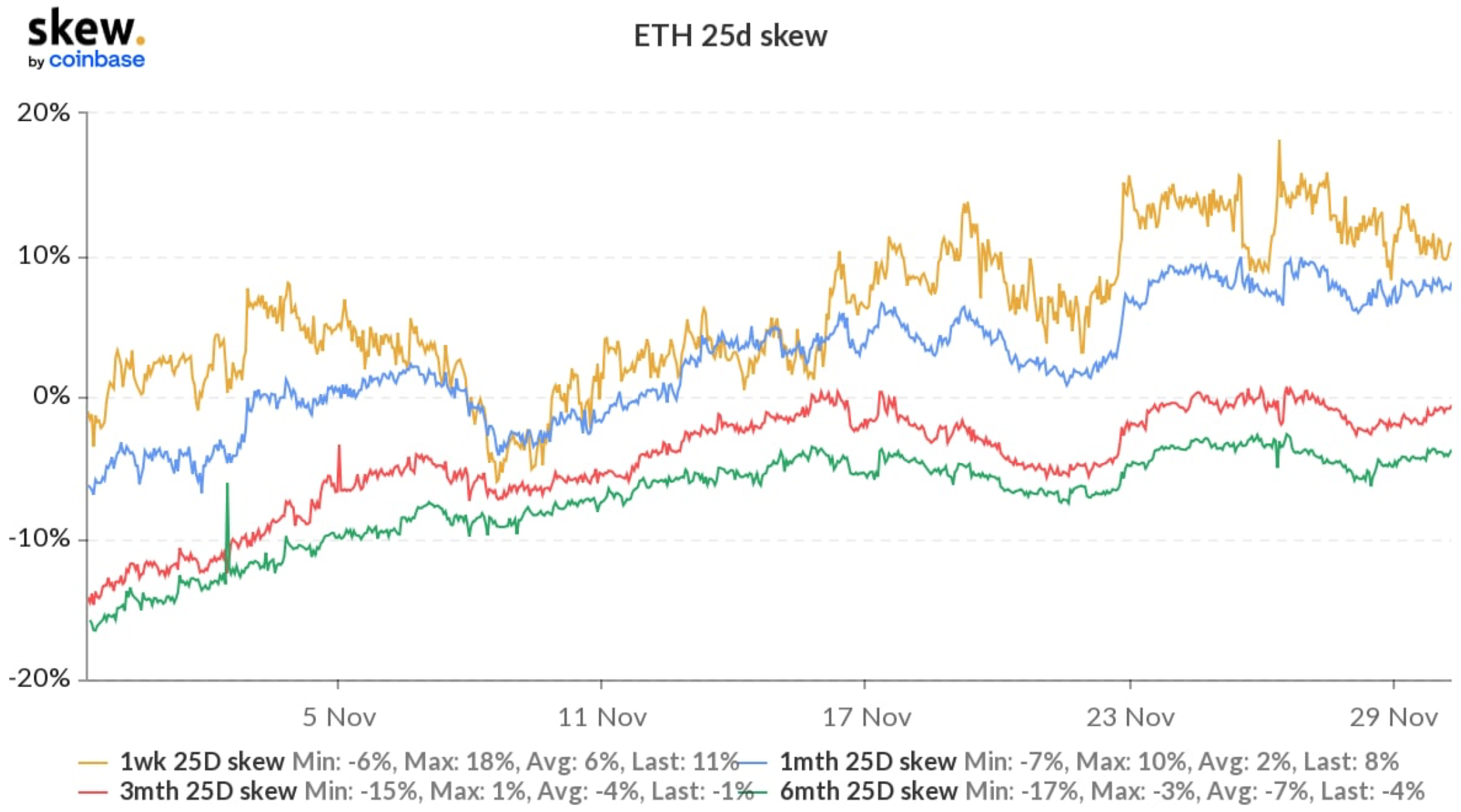 Ethereum (ETH) is currently trading at $4,357, having extended its outperformance versus BTC by 3.94% over the past week. ETH skews have finally returned all their gains, turning positive for all maturities 60 days and under. Sunday showed a sign of relief as $4k spot prices proved to hold up, causing skews to inch higher.
