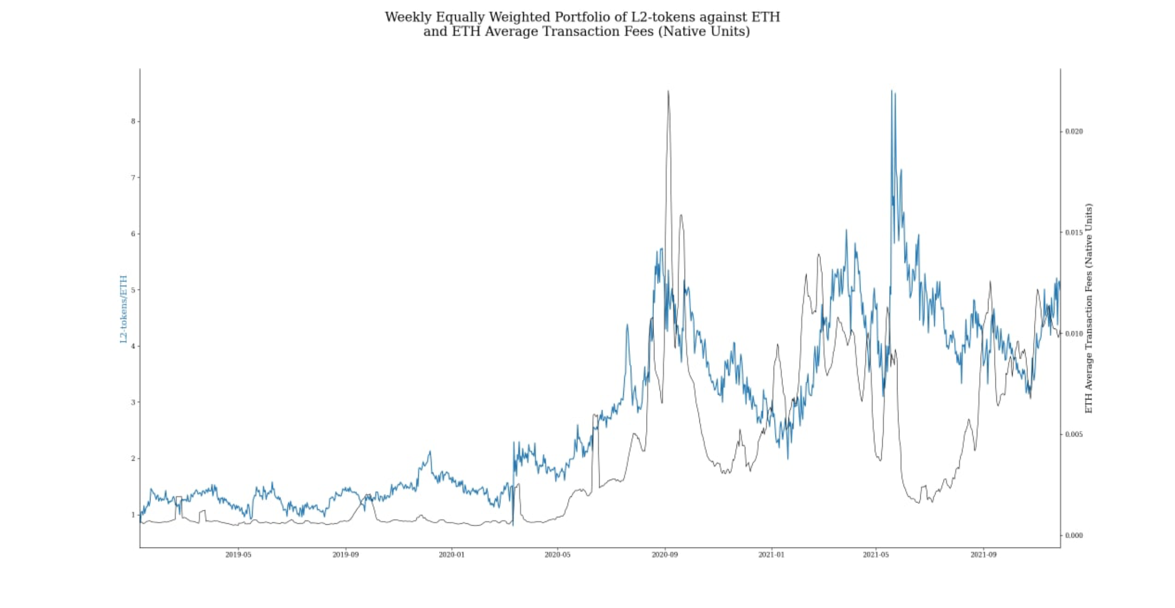 In the chart below, I have backtested a trading strategy that on a weekly basis reinvested capital in all of the L2 tokens with an equally weighted scheme and short ETH for the same notional amount. At the time of creation, the portfolio is assumed to be equal to one. In grey are shown the ETH Average Transactions Fees in Native Units according to Messari.io data.