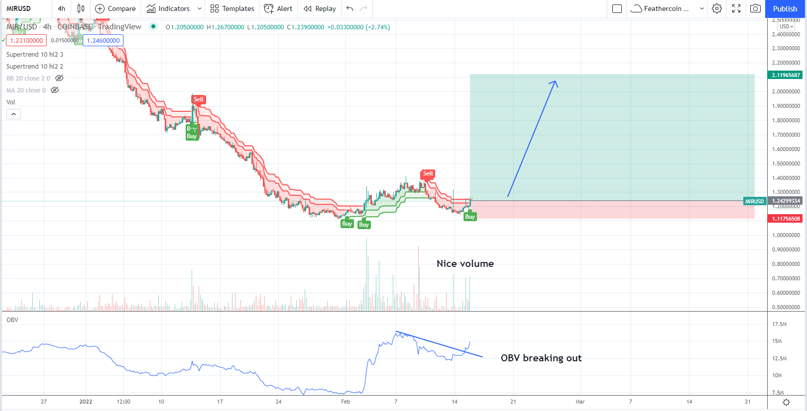 “Large green volume candles coming in near the bottom, super trend 1/2 flipping bullish while OBV is breakout out and showing strength,” tweeted IncomeSharks on Wednesday.