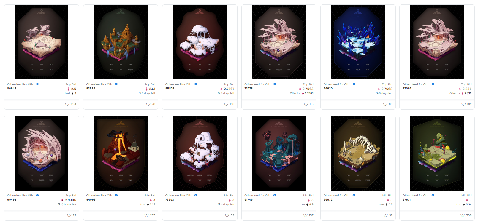 Otherdeed NFTs are key to claiming land in the Otherside metaverse. Each NFT has a unique mix of environment and sediment – some have resources, others contain powerful artifacts, and an alien (“Koda”) roams on a few. Of the first 100’000 NFTs for the virtual world, the majority were sold in an auction, with existing owners of Bored Ape NFTs and the development team getting some land.