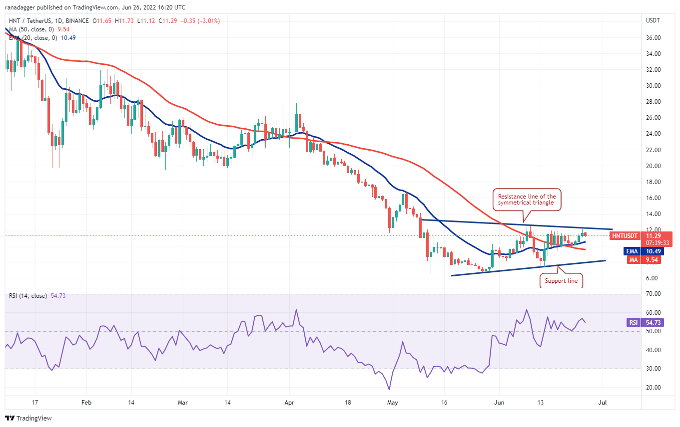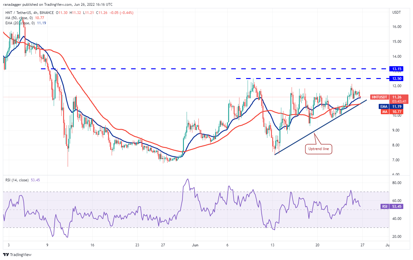 If buyers propel the price above the resistance line of the channel, it will suggest a potential change in trend. The HNT/USDT pair could then rally to $16.50 and later to the pattern target of $18.50.