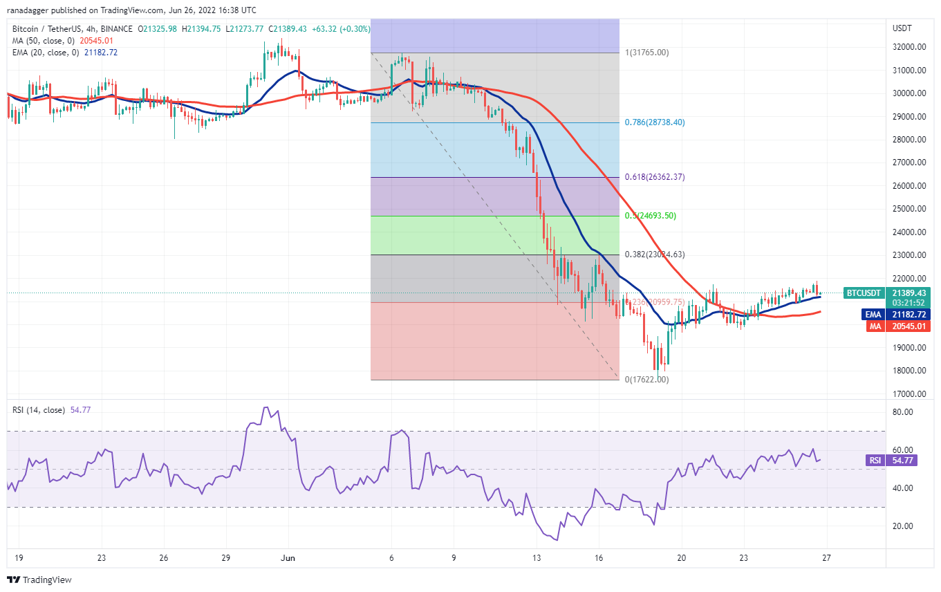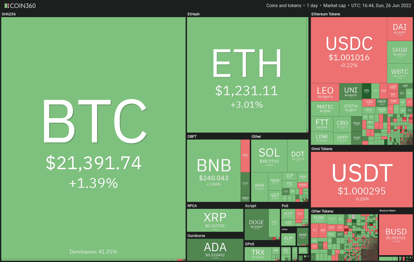 Bitcoin’s relief rally is facing stiff resistance near $22,000 as seen from the long wick on the June 26 candlestick. This indicates that the bears are not willing to give up their advantage and are selling on rallies.